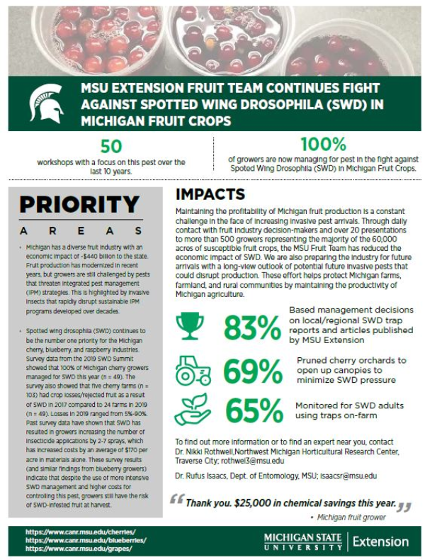Maintaining the profitability of Michigan fruit production is a constant challenge in the face of increasing invasive pest arrivals. Through daily contact with fruit industry decision-makers and over 20 presentations to more than 500 growers representing the majority of the 60,000 acres of susceptible fruit crops, the MSU Fruit Team has reduced the economic impact of SWD. We are also preparing the industry for future arrivals with a long-view outlook of potential future invasive pests that could disrupt production. These effort helps protect Michigan farms, farmland, and rural communities by maintaining the productivity of Michigan agriculture.