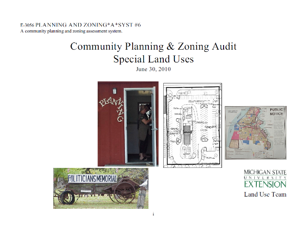 Planning and Zoning*A*Syst. #6: Community Planning & Zoning Audit, Special Land Uses (E3056), provides a review of the administrative structure for handling special use permits: pre-applications, applications, public notification, record keeping and use of standards in making decisions. By Brad Neumann, Senior Extension Educator; Kurt H. Schindler, Senior Extension Educator; and Jasneet Sharma, Extension Educator.
