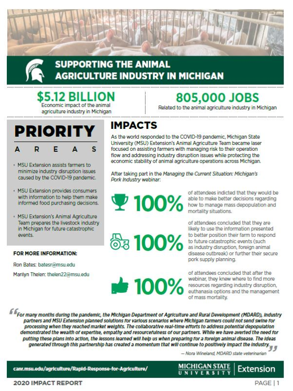 Through the efforts of the MSU Extension Animal Agriculture Team and strong partnerships with the MDARD and MPPA, the pork and small ruminant industry was able to navigate the uncertainty of industry disruption with minimal loss. Farmers also were able to access additional funding opportunities that would help them navigate the period of depressed income because of industry disruption. The pork industry’s experience will also better prepare all Michigan livestock and poultry producers for catastrophic events that may happen in the future and further the secure food supply plans being developed for the state.