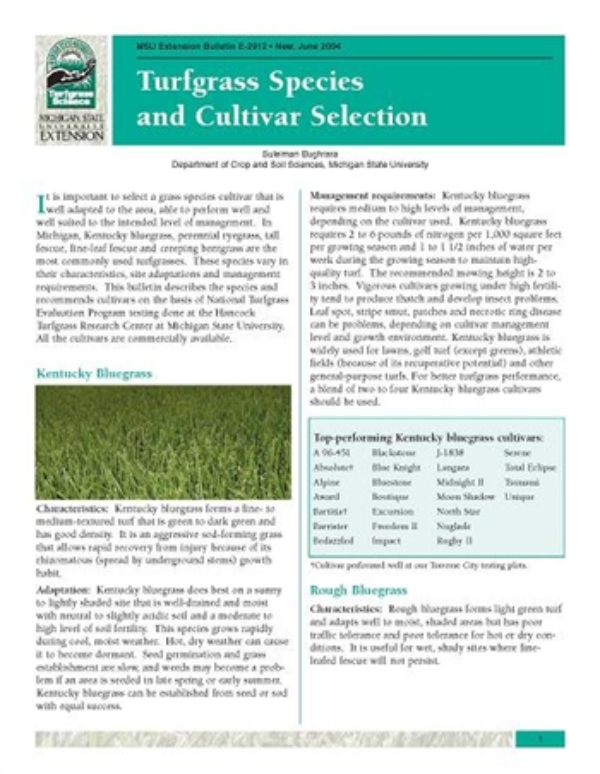 It is important to select a grass species cultivar that is well adapted to the area, able to perform well and well suited to the intended level of management. In Michigan, Kentucky bluegrass, perennial ryegrass, tall fescue, fine-leaf fescue and creeping bentgrass are the most commonly used turfgrasses. These species vary in their characteristics, site adaptations and management requirements. This bulletin describes the species and recommends cultivars on the basis of National Turfgrass Evaluation Program testing done at the Hancock Turfgrass Research Center at Michigan State University. All the cultivars are commercially available.
