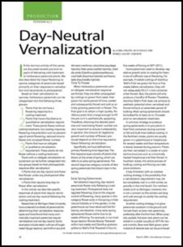 In the last two articles of this series, we discussed several practical aspects of delivering cold treatment to herbaceous perennial plants. We also described the major flowering response categories of perennials based primarily on their response to vernalization and secondarily to photoperiod.