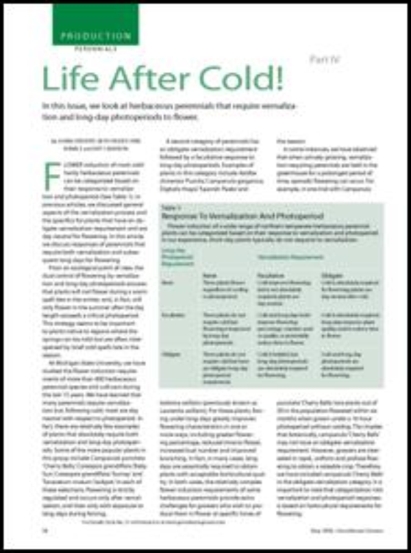 F LOWER induction of most coldhardy herbaceous perennials can be categorized based on their response to vernalization and photoperiod (See Table 1). In previous articles, we discussed general aspects of the vernalization process and the specifics for plants that have an obligate vernalization requirement and are day neutral for flowering. In this article, we discuss responses of perennials that require both vernalization and subsequent long days for flowering.