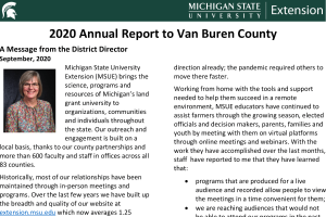 Despite the ongoing pandemic of 2021, Michigan State University Extension continued to work for Van Buren County youth, adults, businesses and communities providing outstanding researchbased education and community development programs. -